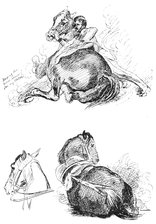 As we girls grew apace we had a Parisian mistress to try and parisianise our Swiss French and an Italian master to try and tuscanise our Genoese Italian, and every Saturday a certain Mr. Standish gave me two hours’ drill in oil painting. How grand I felt! He gave me his own copies of Landseer’s horses’ heads and dogs as models. This wasn’t very much, but it was a beginning. My lessons in the elementary class at the S. Kensington School of Art are not worth mentioning. The masters gave me hateful scrolls and patterns to copy, and I relieved my feelings by ornamenting the margins of my drawing paper with angry scribblings of horses and soldiers in every variety of fury. That did not last long. This entry in the Diary speaks for itself:—