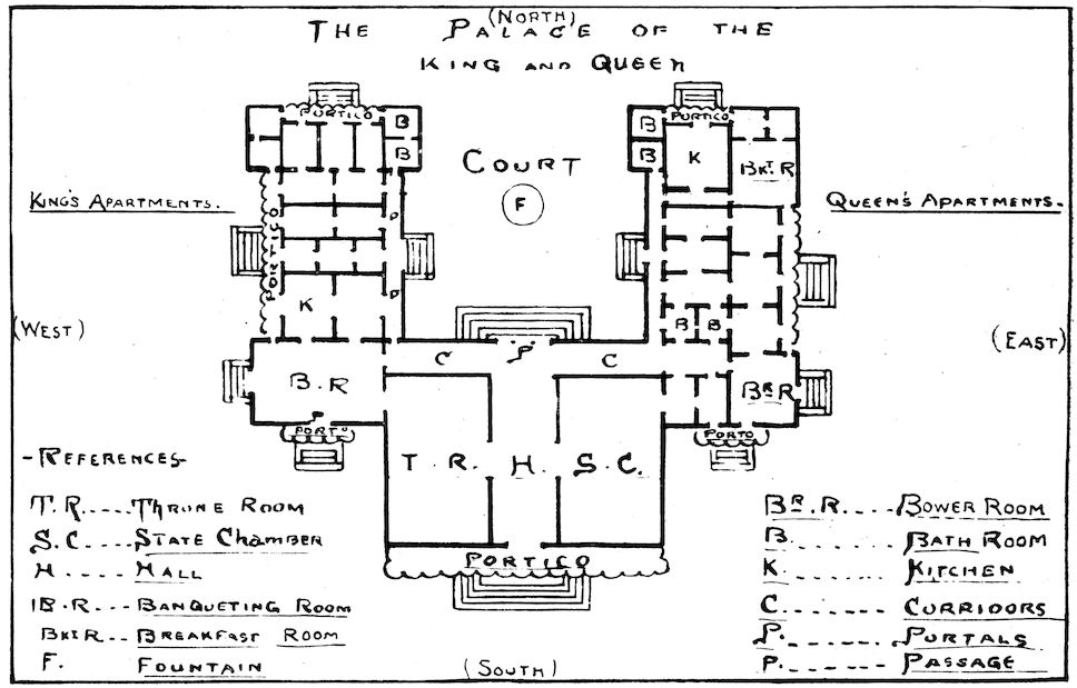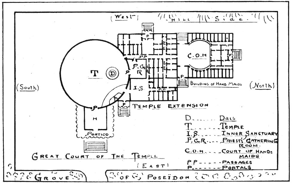 Great and glittering was this oblong state chamber. Its high, arched ceiling of ivory and bronze was rich in 8gilding. The walls were paneled in ivory overlaid with silver, many of the panels being inscribed with the laws of Poseidon and Atlas. The pavement was of blue and white marbles. To this fell from the apertures hangings of finest yellow linen. The seats were of carved ebony; and at the farther end were the golden throne, and the ivory chairs of the rulers, priests, and nobles.