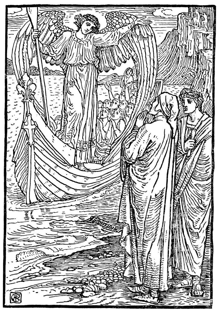 e’s eyes were just beginning to get used to the sunlight. Suddenly he saw a strange white light coming along the sea towards them. He was astonished. As it came nearer and nearer the light grew more and more dazzling, and Dante saw that it was a glorious and radiant angel! He fell upon his knees and dropped his gaze to the ground, for the face of the angel was so bright that he could not look upon it. The strange and beautiful being came swiftly forward, bringing with him a small boat full of people, the very water became resplendent with light as the boat moved swiftly through it, yet the angel had neither oar nor sail. His shining wings, spread high above his head, seemed to waft the boat along by some invisible power. He landed the people, and—quick as a sunbeam, was gone.