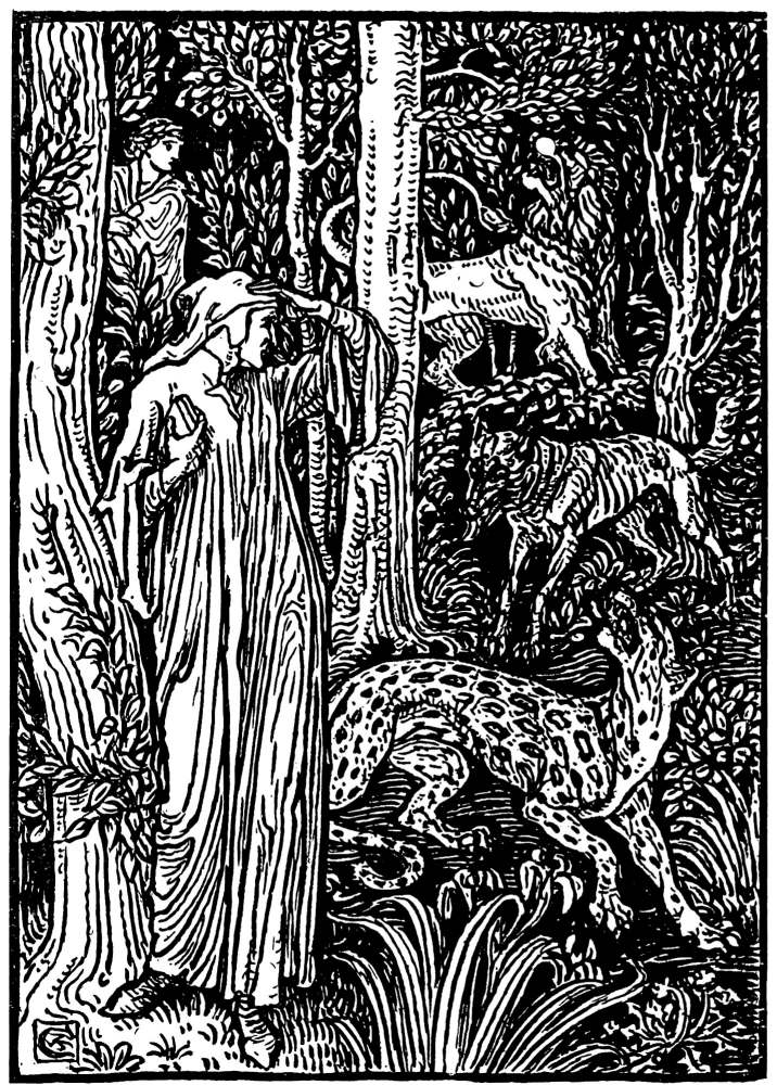 Through an opening where the tall trees had not grown quite so thick, he saw in the distance a great mountain, on the top of which the sun was shining brightly. “Ah!” thought he to himself, “if I can but reach the top of that mountain I am sure I can see a long way in every direction. No woods can grow tall enough to keep me from finding my path then!” So with fine courage he started toward the mountain, but he had not walked far when a beautiful, spotted panther stood with glaring eyes in his pathway. He trembled, for he knew that going forward meant that he would be destroyed. He turned hastily aside into another path, but he had gone only a short distance in this direction before he saw a huge lion coming towards him. In greater haste than before he turned into still another path. His heart was beating very fast now, and he hastened along without taking much notice of what lay before him. Suddenly he came upon a lean and hungry wolf, which looked as if he could devour half a dozen men. Dante turned and fled back into the dark woods “where the sun was silent.” He thought, “What is the use of trying to get out of this terrible forest? There are wild beasts on every side. If I escape one I am sure to be devoured by another; I might as well give up trying.” He had now lost all hope.