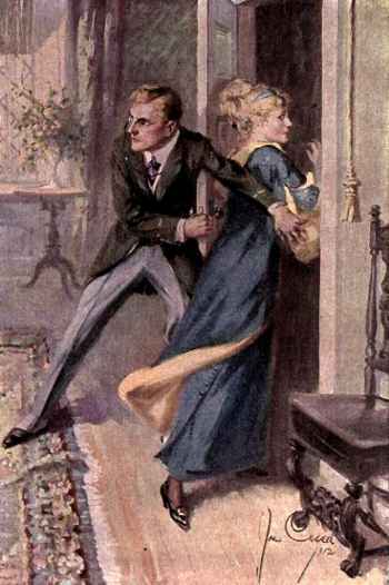 He was still staring at the closed window, when he was startled by the guard's whistle, and the slamming of the carriage doors. Turning quickly, he ran back, trying to find his compartment, but it was too late; the train was already moving. Flinging off a porter's detaining hand, he jumped on to the foot-board and wrenched open the nearest door. The impetus flung him headlong into the lap of a lady,—the sole occupant of the carriage. To his horror and amazement, instead of listening to his apologies, she uttered a piercing shriek and fell forward into his arms. For a moment Crichton was too dazed to move. There he knelt, tightly clasping her limp form and wondering fearfully what would happen next. At last he managed to pull himself together, and staggering to his feet, laid her gently on the seat near the window. Strangely enough, he had had no idea, so far, as to the appearance, or even the age, of the lady with whom fate had thrown him into such intimate contact: consequently he now looked at her with considerable curiosity. Her slight, graceful figure proclaimed her youth, but her face was completely concealed by a thick, black veil, which prevented him from so much as guessing the outline of her features. As she continued to show no sign of returning consciousness, Crichton looked helplessly around for some means of reviving her. More air was what she needed; so with much trepidation he decided to unfasten her veil. His fingers fumbled clumsily over their unaccustomed task, but finally the last knot was disentangled, the last pin extracted. The unknown proved to be even younger than he expected, and to possess beauty of the kind which admits of no discussion. At present, however, it was sadly marred by a red welt, probably the result of a fall, Crichton decided, which disfigured her left cheek. A minute before he had been cursing his luck, which invariably landed him in strange adventures, but at the sight of her beauty, our hero suddenly ceased to find the situation annoying. His interest, however, increased his alarm. What if she were dead or dying? Heart attacks were not uncommon. Bending over her, he laid his hand on her heart, and as he did so, the long lashes lifted, and a pair of sapphire blue eyes looked straight into his. Before he had time to move, she threw out both hands and cried: "Oh, let me go!"