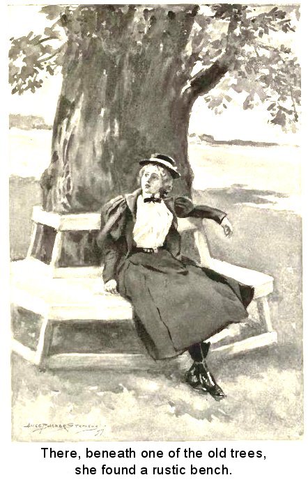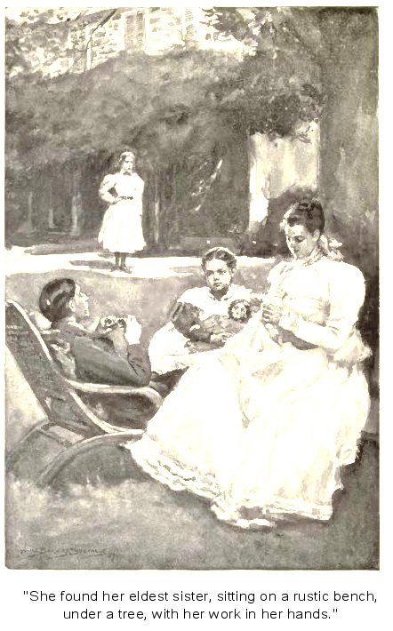 “She found her eldest sister sitting on a rustic bench, under the trees, with her work in her hands” |