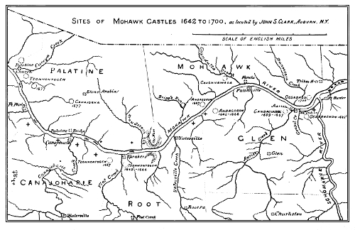 I have reserved for a most especial and grateful acknowledgment the name of Gen. John S. Clark, of Auburn, N. Y. My work is indebted to him for a treasure of information which he alone could give. In the knowledge of Iroquois localities in New York State, particularly those of two centuries ago, and the trails over which missionaries from Canada travelled so painfully to villages where they labored so hard and yet successfully,—he is the undoubted pioneer. Almost all we know in this branch of archæology is owing to him. It was my privilege in company with my uncle, and with Gen. Clark for pilot, to spend a memorable week in [Pg viii] search of Indian localities along the Mohawk, from the mouth of Schoharie Creek to the farthest castle of the wolf clan opposite Fort Plain. We visited and verified, under the General's direction, no less than eleven sites in this one week. An account of the most important of these sites can be found in the contributions of Gen. Clark, as explanatory footnotes, to "Early Chapters of Mohawk History." This work consists of translations into English of selected letters from the Relations Jesuites. For these translations we are indebted to the lamented Dr. Hawley, late pastor of the First Presbyterian Church in Auburn. Guided by the wise advice of General Clark, I was able afterwards to make other independent journeys, and familiarize myself with Indian trails passing near my native town, above all those followed by Tekakwitha in her escape to the "Sault." I owe to Gen. Clark's kindness the valuable map of Mohawk Castle Sites, to be found in this book and drawn expressly for it by his hand.