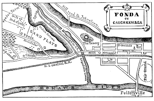 "Gandawague was in 1677 unquestionably on the hill northwest of Fonda, about a mile back from the river. A fine spring on the west bank of the Cayudutta marks the central point of the village, and the pits some distance to the north were their granary where they stored their corn. A smaller village was probably near Mr. Veeder's house."