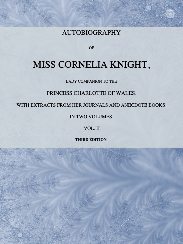 65. “I received a visit from Miss Knight. Her presence recalled Kensington and the poor Princess to my mind. She conversed with sense and kindliness on these topics, but her exceeding prudence always restrains the expression of her feelings, and she appeared averse to dwelling on the subject. The only remark she made which struck me as singular was that, in speaking of the King’s illness and probable decease, she said she conceived it would be a fortunate event for the country. Miss Knight has a very refined mind, and takes delight in every subject connected with literature and the arts. She is exceedingly well read, and has an excellent judgment in these matters.... I alluded once to the poor Princess Charlotte’s death, but Miss Knight only replied, ‘Ah, that was a melancholy event!’ and passed on to other subjects. She did not impress me with the idea of lamenting the Princess so much as I should have supposed she would have done. But perhaps she may, in reality, mourn her melancholy fate, and that she only forbears speaking of her lest she should say too much. Certainly Miss Knight was very ill-used by the Queen and the Regent, and I do not think Princess Charlotte liked, although she esteemed her. Miss Knight was not sufficiently gay, or of a style of character suited to her Royal Highness.”—Lady C. Campbell’s Diary, vol. iii. p. 7.
