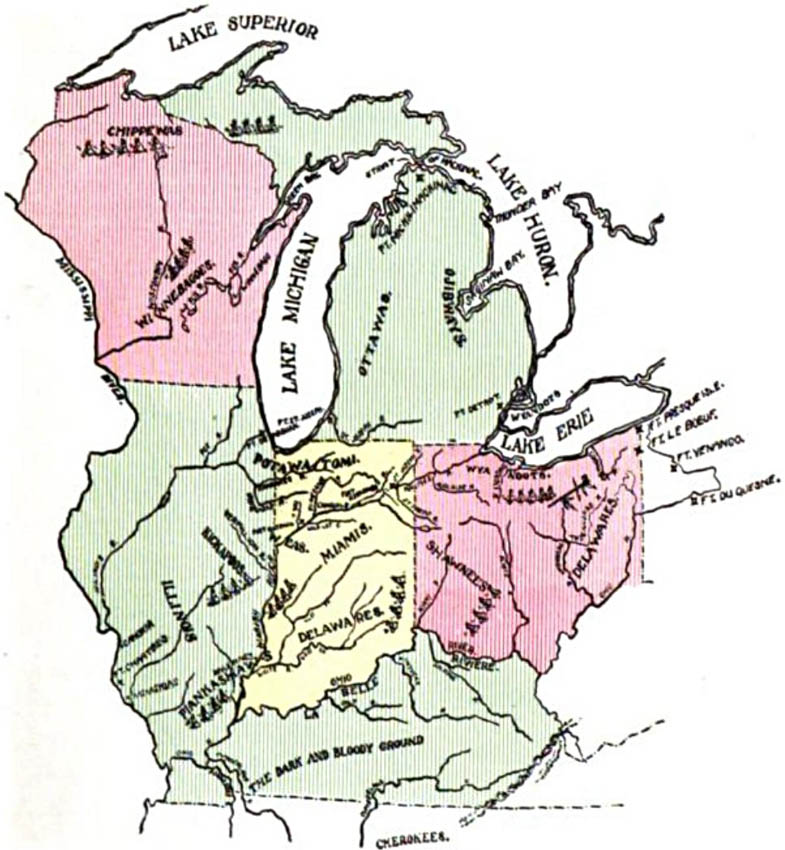 Over this territory, and to gain control of these tribes, England and France had waged a long and bitter conflict, and the gage of battle had been the monopoly of the fur trade. The welfare of the savages was regarded but little; they were the pawns in the game. The great end to be acquired was the disposal of their rich peltries. No country was more easily accessible to the early voyageurs and French fur traders. It was bounded on the north and northeast by the chain of the Great Lakes, on the south by the Ohio, and on the west by the Mississippi. The heads of the rivers and streams that flowed into these great watercourses and lakes were connected by short portages, so that the Indian trapper or hunter could carry his canoe for a few miles and pass from the waters that led to Lake Michigan or Lake Erie, into the streams that fed the Mississippi or the Ohio. The headwaters of the Muskingum and its tributaries interlocked with those of the Cuyahoga; the headwaters of the Scioto with those of the Sandusky; the headwaters of the Great Miami with those of the Wabash and the St. Marys. In northern Indiana another remarkable system of portages appeared. The canoes of the traders were carried some eight or ten miles from the little Wabash to the Maumee, placing the command of the whole Wabash country in the hands of the Detroit merchants. The sources of the Tippecanoe were connected by portages with the waters of the St. Joseph of Lake Michigan, and a like connection existed between the waters of the Tippecanoe and the [Pg 9]waters of the Kankakee. These portages were, as General Harrison observes, "much used by the Indians and sometimes by traders." LaSalle passed from Lake Michigan to the waters of the St. Joseph, thence up that river to a portage of three miles in what is now St. Joseph county, Indiana, thence by said portage to the headwaters of the Kankakee, and down that river to the Illinois. At the post of Chicago the traders crossed from Lake Michigan by a very short portage into the headwaters of the Illinois, and General Harrison says that in the spring, the boats with their loading "passed freely from one to the other." In Michigan the heads of the streams that flowed into Lake Huron interlocked with the heads of those that went down to Lake Michigan. In Wisconsin, the voyageurs passed from Green bay up the Fox river to Lake Winnebago, thence by the Fox again to the portage between the Fox and Wisconsin, thence down the Wisconsin river to the Mississippi. Through this important channel of trade passed nine-tenths of the goods that supplied the Indians above the Illinois river and those in upper Louisiana.