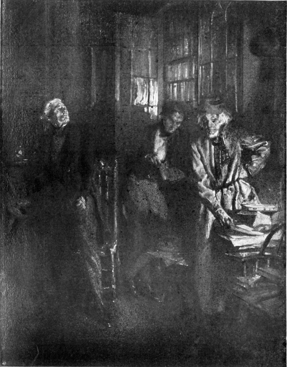 I saw her hands beat together as they did when she was agitated. I turned then to look at her, and what I saw left me silent. "Come," said I at last, "let us go to her." We edged across the floor.