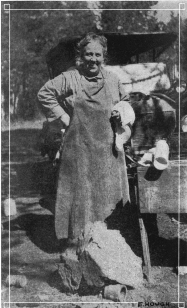 I know that next year I shall again see Maw leaning against a big pine, as she sits upon the ground drinking real handmade coffee of her own from a tin cup with the handle cut so it will nest down in the box. Maw's meals do not cost her[12] four bits a throw, because they brought things along. Paw catches a trout sometimes on the cane pole that hangs alongside the car; not always, but sometimes, he catches one. And Maw, once she had conquered the notion that you ought to skin a trout the way you do a bullhead back in Ioway, took to cooking trout naturally; and her trout, with pancakes and sirup, to my notion beat anything the hotel chef in the best hotel can do. Maw does not worry about a room with bath, though sometimes when the rain comes through the old wall tent she gets both. The pink and green war paint which you sometimes see beneath Maw's specs when you meet her on the road represents only the mark of the bedquilts, where the colors were not too proud to run.