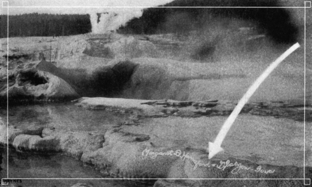 You see, the geysers rattled Maw, there being so many and she loving them all so much. One day when they were camped near the Upper Basin, Maw was looking down in the cone of Old Faithful, just after that Paderewski of the park had ceased playing. She told me she wanted[19] to see where all the suds came from. But all at once she saw beneath her feet a white, shiny expanse of something that looked like chalk. At a sudden impulse she drew a hatpin from her hair and knelt down on the geyser cone—not reflecting how long and slow had been its growth.