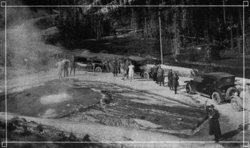 “The safest thing you could do is to doubt them geysers,” interrupted her husband, who overheard her. “I was walking[34] round on them just the other day, right where signs said 'Dangerous.' It didn't seem to me there was no danger at all, for nothing was happening. But one of them rangers come up to me and asked if I didn't see the sign. 'That's all right, brother,' says I. 'I've tried this place and it's all right.' And right then she went off.”