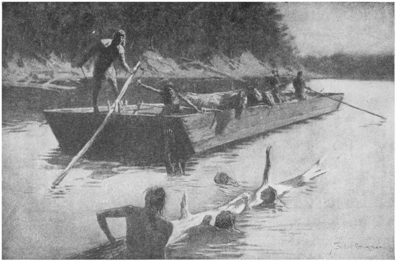 The builder turns it over, and where he finds a bubble in the pitching of a seam he bends down and puts 21 his lips to it, sucking in his breath, to find if air comes through. So he tests it, well and thoroughly, mending and patching slowly and carefully, until at last it pleases him throughout. And then he places his new-made ship on the water, where it sits high and light, spinning and turning at its tether, never still for an instant, but shifting like a wild duck under the willows, responsive to the least breath of the passing airs. It is eager to go on. It will go far, in its life of a year or two. If it gets a wound from the rocks, or from the clumsiness of the tyro that drives it upon the beach instead of anchoring it free, then it is easily mended by a strip of bark and some forest pitch. When at last it loses its youth, and cracks or soaks in water so freely that it takes too long to dry it at the noonday pipe-smoking, then it is not so difficult to build another in the forest.