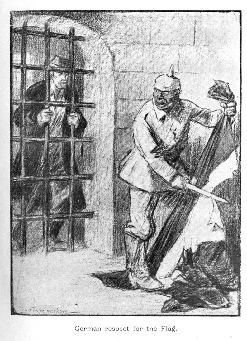 Such narrow-minded tyranny always defeats its own objects. Burgomaster Max's proud answer to General von Luttwitz's "advice" to remove the flags became the password of the patriots. Every Bruxellois henceforth "waited for the hour of reparation." A great number of women went to prison rather than remove the emblems of Belgium which they wore. Stories passed from lip to lip. Their accuracy I would not guarantee, but they belong to the epic of the war and are true to the spirit of the people. A young lady, who was jeered at by a German officer because she was wearing King Albert's portrait, is said to have answered his "Lackland" with, "I would rather have a King who has lost his country than an Emperor who has lost his honour." Another lady, sitting in a tram-car opposite a German officer, was ordered by him to remove her tricolour rosette. She refused to do so, and, as he threatened her, defied him to do it himself. The Boche seized the rosette and pulled .. and pulled .. and pulled. The lady had concealed twenty yards of ribbon in her corsage.