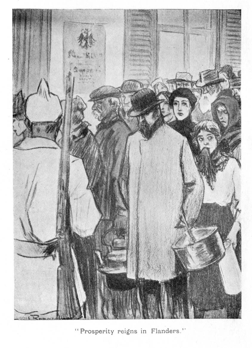 We must now deal with the second factor which makes the conditions worse in Belgium than in Germany. While German peace-factories, ruined by the blockade, have been turned into war-factories, the majority of Belgian industries have remained idle. In spite of the high wages offered by the Germans—some skilled workmen were offered as much as £2 and £2 10s. per day—the workers resisted the constant pressure exerted upon them and preferred to live miserably on half-wages or with the help given them by the "Comité National" rather than accept any work which might directly or indirectly help the occupying power. If a few thousands, compelled by hunger or unable to resist their conquerors' threats, passed the frontier, all the rest of the working population kept up, under the most depressing conditions, a great patriotic strike, the "strike of folded arms." If they could not, as the 20,000 young heroes who crossed the Dutch frontier, join the Belgian army on the Yser; they could at least wage war at home and oppose to the enemy the impenetrable rampart of their naked breasts. It should not be said, when King Albert should return to Brussels at the head of his troops, that his subjects had not shared the sufferings of his soldiers. They should also have their wounds to show, they should also have their dead to honour.