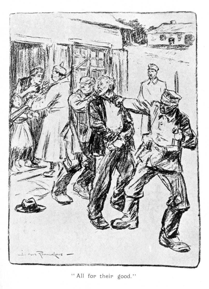 We must therefore not imagine that Governor von Bissing got up one fine morning, called for pen and ink, like King Cole for his bowl, and wrote a proclamation to the effect that all Belgians of military age would be reduced to slavery and obliged, under the penalty of physical torture and under the whip of German sentries, to dig trenches behind the Western front or to turn shells in a German factory. Any fool—any Goliath—might have done that.