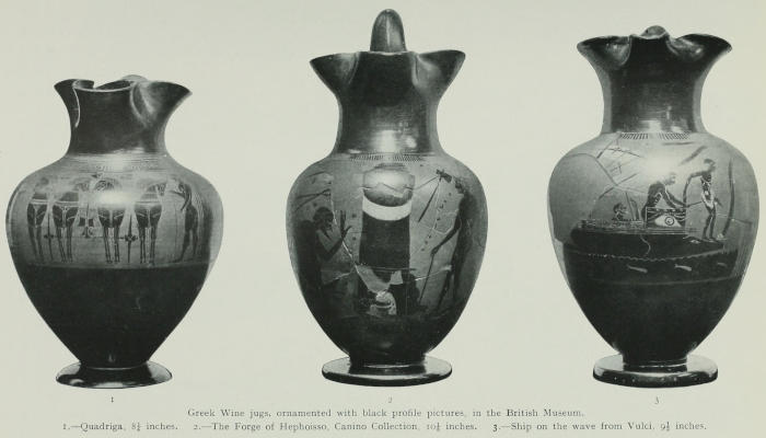 Figures in black profile join hands round the wine-cups and oil-jars made by Etruscan potters; in silhouette men are armed to battle, women weave cloth and grind corn, children play at ball and knuckle-bones, life-like in shadow.