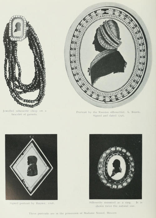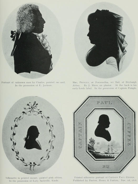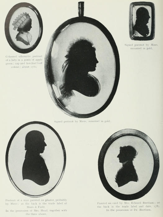 My sincere thanks are due to Mrs. Head, Mrs. Whitmore, Madame Nossof, Mrs. Wadmore, Mrs. Lea Carson (of Philadelphia), Mrs. Whetridge, Mr. Francis Wellesley, Mr. H. Palmer, Mr. Desmond Coke, Mr. Holworthy, Captain Pringle, Mr. H. Terrell (of Boston), Mr. Laurence Park, Dr. Beetham (descendant of Mrs. Beetham, the fine eighteenth-century silhouettist), Mr. J. A. Field, for the interesting series of portraits painted by his great-grandfather, and many others, who, possessing silhouettes, have allowed me to visit and make a study of their collections or have sent specimens for examination. Without their courtesy, and that of many others who gave me facilities for studying some thousands of specimens and advertisements, it would have been impossible to write this book. A subject on which there exists no written history, and which has hitherto received scant attention, requires much research amongst a large number of examples, amongst old newspaper matter, contemporary social history, and the trade labels of the silhouettists, for its faithful record.