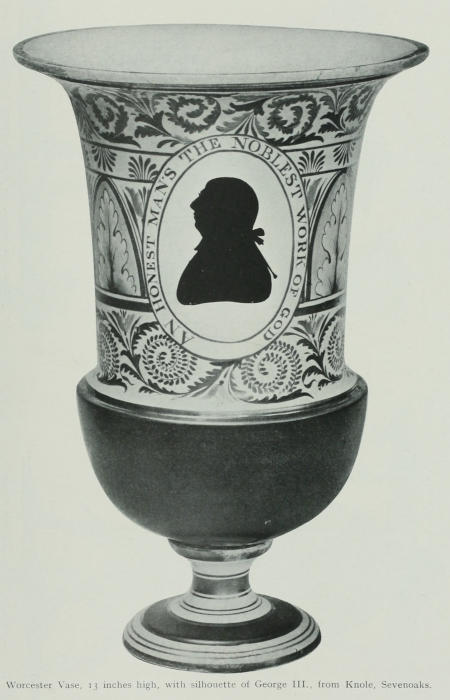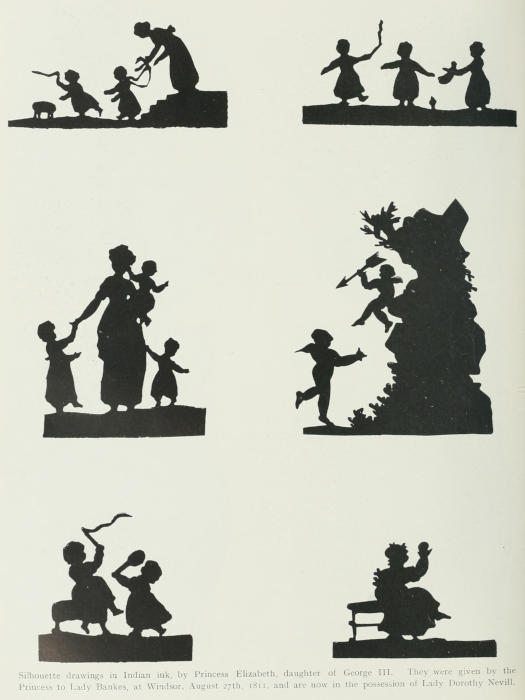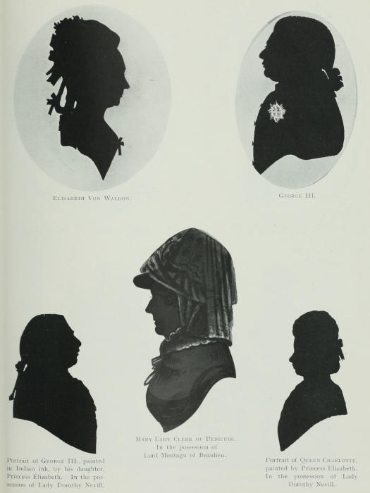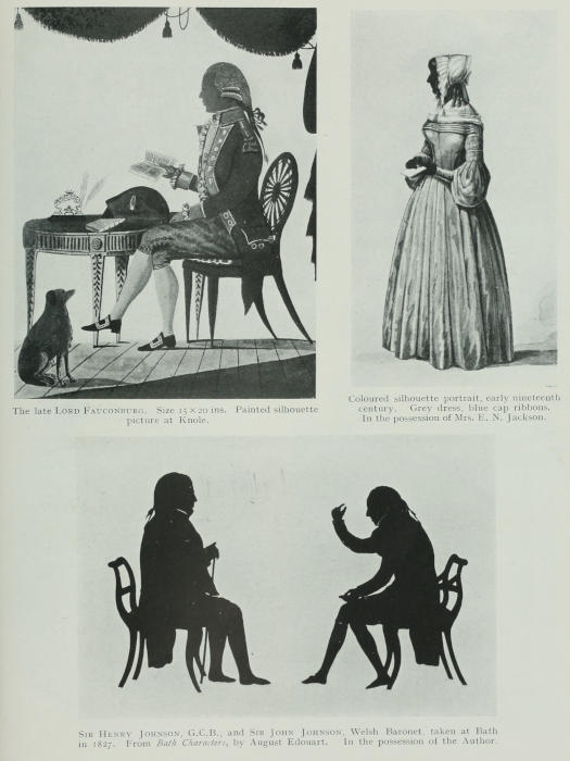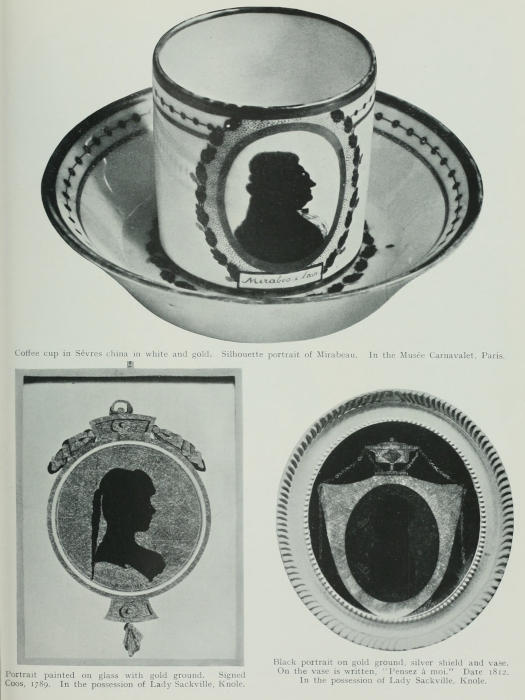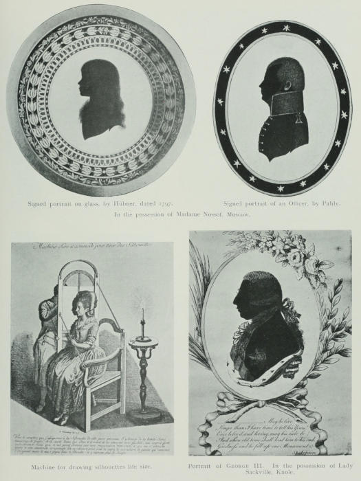 More especially I am grateful to those who have kindly permitted me to reproduce their silhouettes, thus making clear to art lovers, and those who take pleasure in the curio, how manifold are the charms of family treasure, which would not otherwise have been available for study. To Herr Julius[2] Leisching, Director Erzerzog Rainer Museum, I am indebted for information concerning silhouettists of Germany and Austria contained in his memorandums of the Industrial Museum; to Sir Sidney Colvin, Keeper of the Prints in the British Museum; to Mr. C. J. Holmes, Director of the National Portrait Gallery; to Mr. T. Corsan Morton, of the National Galleries of Scotland; to Mr. D. E. Roberts, of the Library of Congress, Washington, for access to special collections; to Mr. Horace Cox and Mr. T. P. O’Connor, with regard to pictures under their control in the “Collector” and the Magazine; to Lady Dorothy Nevill, for placing at my disposal the beautiful silhouette work of Princess Elizabeth, daughter of George III.; to Lady Sackville, for allowing me to study the silhouettes of Knole, and to reproduce some of the silhouette porcelain in her possession.