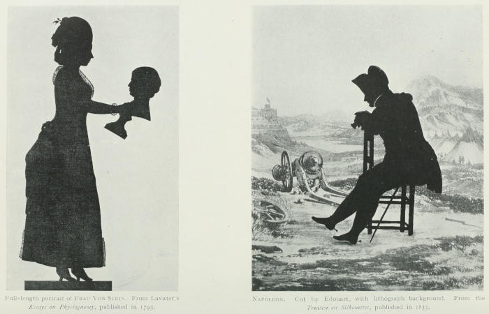 Goëthe’s letters to his mother are full of allusions to the[10] novel portraiture which had been brought to his notice by Lavater, the Zürich divine, whose essay on Physiognomy, written for the promotion of the knowledge and love of mankind, is still read in Germany. The edition of 1794 is before us, and shows hundreds of silhouette drawings, for he wrote of the importance of reading character from people’s faces, and used the silhouette for this purpose. Thus the shadow portrait, once the amusement of amateurs, now began to have scientific significance.