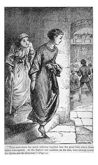 Clarice, with another courtesy and a murmur of thanks, took her seat in the recess of the window, where her mother was already sitting. For these two were mother and daughter; a middle-aged, comfortable-looking mother, with a mixture of firmness and good-nature in her face; and a daughter of some sixteen years, rather pale and slender, but active and intelligent in her appearance. Clarice’s dark hair was smoothly brushed and turned up in a curl all round her head, being cut sufficiently short for that purpose. Her dress was long and loose, made in what we call the Princess style, with a long train, which she tucked under one arm when she walked. The upper sleeve was of a narrow bell shape, but under it came down tight ones to the wrist, fastened by a row of large round buttons quite up to the elbow. A large apron—which Clarice called a barm-cloth—protected the dress from stain. A fillet of ribbon was bound round her head, but she had no ornaments of any kind. Her mother wore a similar costume, excepting that in her case the fillet round the head was exchanged for a wimple, which was a close hood, covering head and neck, and leaving no part exposed but the face. It was a very comfortable article in cold weather, but an eminently unbecoming one.