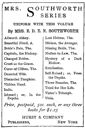"Oh, me!—oh, dear me!" sobbed the siren. "It was the sin of helplessness and cowardice. I dreaded discovery so much! Every circumstance alarmed me. Your arrival and your long mysterious conversation with madam alarmed me. I thought exposure imminent. I feared to lose this home, which, lonely, dreary, hopeless as it is to me, is yet the only[8] refuge I have left on earth. I am penniless and helpless; and but for this kind family I should be homeless and friendless. Think if I had been cast out upon the world what must have been my fate!"
