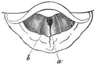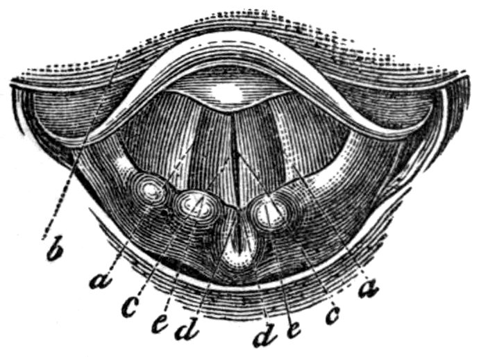 The larynx is a sound-giving organ belonging to that class of wind instruments called reed instruments, although it differs in various respects from all artificial arrangements of the kind. The sound or tone-generating apparatus of the larynx consists of tense, elastic membranes, the so-called chordæ vocales, which are enclosed in a sounding case composed of movable cartilaginous plates, and may be stretched by a certain apparatus of muscles in very different and exactly measurable degrees. They are made to vibrate audibly by a current of air impelled with various degrees of force and at will by the lungs in expiration through the narrow chink (glottis) formed by the fine edges of the chords. Thus the lungs correspond to the bellows of the organ; the trachea, at the top of which the vocal instrument is placed, answers to the conduit (Windrohr), and the cavity of the throat in front of the instrument with its two avenues, the mouth and the nostrils, to the resonance pipe (Ansatzrohr).