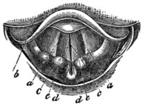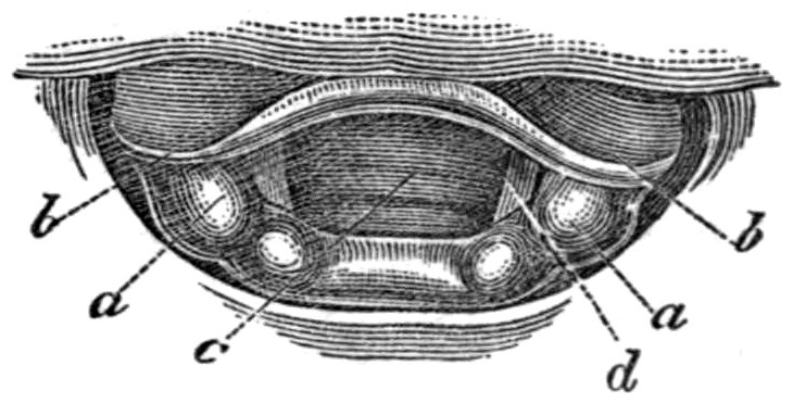 The epiglottis is fixed at the anterior portion of the larynx, at the root of the tongue, within the angle formed by the two surfaces of the thyroid cartilage. It is a very elastic fibro-cartilage, freely moving in a posterior direction. Its color is yellowish and its general form that of a spoon; its upper surface is covered with a multitude of little mucous glands set in shallow cavities. In the downward passage of food the epiglottis covers the upper orifice of the larynx like a valve, over which the food passes into the œsophagus or gullet, without being able to enter the larynx and the trachea. In the centre of its interior side there is a little rounded cartilage, movable in every direction, which has as yet no name. Czermak mentions it first in his observations with the laryngoscope. In the male larynx, after the voice has altered, the cartilages become more or less ossified and gradually harden with increasing age. The cartilages of the female larynx, with rare exceptions, usually continue with little or no change. The muscles, by which the movements of the larynx are effected, are: