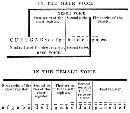 | First series of the chest register. | Second series of the chest register. | First series of the falsetto register. | Second series of the falsetto register. | Head register. |
