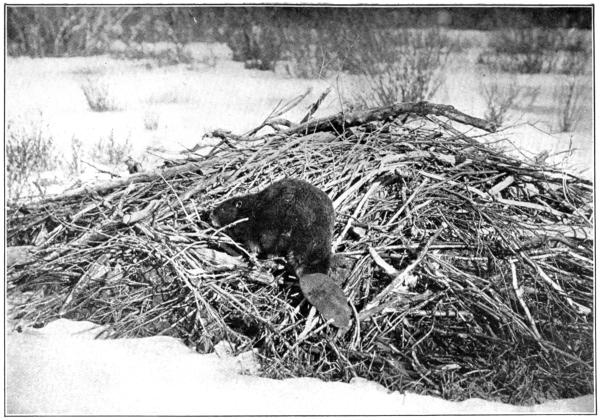 The beaver is practical, peaceful, and industrious. He builds a permanent house and keeps it clean and in repair. Beside it he stores food-supply[Pg 30] for the long winter. He takes thought for the morrow. These and other commendable characteristics give him a place of honor among the hordes of homeless, hand-to-mouth folk of the wild. During the winter he has but little to do except bathe and eat his two or three meals a day from the food he has stored in the autumn. Towards spring, when his wild neighbors are lean, hungry, and cold, he is fat and comfortable. In the spring he emerges from the house, but then his only work is occasionally to cut a twig for food. In the summer he plays tourist. He visits other colonies, and wanders up and down streams, going miles from home. In the late summer or early autumn he returns, makes repairs, and harvests food for winter.