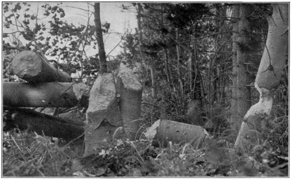 Rarely does the beaver give any thought to the direction in which the tree will fall. In a few instances, however, I have seen what appeared to be an effort on the part of the beaver to fell a tree in a given direction. From an uncomfortable place he cut the lowest notch on the side on which he probably wanted the tree to fall. On one of these occasions, the aspen tree selected stood in an almost complete circle of pines. The beaver took pains to cut the first and lowest notch in this tree directly opposite the opening in the pines. I have seen a number of instances of this kind. And he will sometimes leave the windward side of a grove on a windy day, and cut on the leeward, so that the felled trees are not entangled in falling.