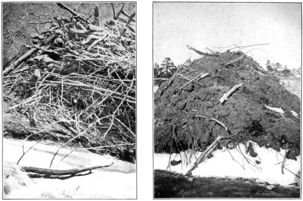 One September day I saw a number of beaver at work upon a half-finished house. One part of the house had been carried up about two feet above the water, and against this were leaned numerous sticks, which stood upon the top of the foundation just above water-level. After these sticks were arranged, they were covered with turf and mud which the beaver scooped from the bottom of the pond. In bringing this earth covering up, the beaver invariably came out of the water at a given point, and over a short slide worn on the side of the house climbed up to the height where they were to deposit their load, which was carried in the fore paws. Then they edged round and put the mud-ball upon the house. From this point they descended directly to the water, but when they emerged with the next handful, they came out at the bottom of the slide, and again climbed up it.