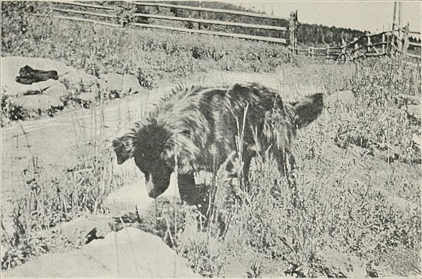 Scotch had minded his own affairs and enjoyed himself in his own way all day long. Most of the time he had followed her closely, apparently indifferent to what happened. But the[20] instant the young woman left the trail and started off in the wrong direction, he sprang ahead and took the lead with an alert, aggressive air. The way in which he did this should have suggested to her that he knew what he was about, but she did not appreciate this fact. She thought he had become weary and wanted to run away from her, so she called him back. Again she started in the wrong direction. This time Scotch got in front of her and refused to move. She pushed him out of the way. Once more he started off in the right direction and this time she scolded him and reminded him that his master had told him to stay with her. Scotch dropped his ears, fell in behind her, and followed meekly in her steps. He had tried to carry out the[21] first part of his master's orders; now he was resigned to the second part of them.