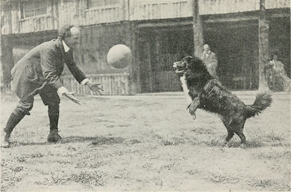 Though apparently matter-of-fact and stolid, he was ever ready for a romp and was one of the most playful dogs. Except at odd times, I was the only playmate he ever had. It was a pleasure to watch him or to play with him, for he played with all his might. He took an intense delight in having me kick or toss a football for him. He raced at full speed in pursuing the ball, and upon overtaking it would try to pick it up, but it was too large for him. As soon as I picked it up, he became all alert to race after it or to leap up and intercept it. If the ball was tossed easily to him, he sprang to meet it and usually struck it with the point of his chin and sent it flying back to me; at short range we were sometimes able to send the ball back and forth between us several times without either one moving in his tracks. If[27] the ball was tossed above him, he leaped up to strike it with head, chin, or teeth, trying to make it bound upward; if it went up, he raced to do it over again. Occasionally he was clever enough to repeat this many times without allowing the ball to fall to the earth.