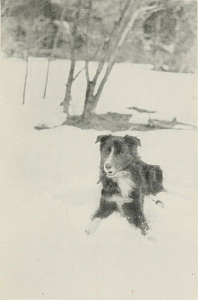 Scotch was an old-fashioned collie and had a face that was exceptionally expressive and pleasing. He was short-nosed, and his fine eyes were set wide apart. When grown he was a trifle larger than the average dog, and was surprisingly agile and powerful[8] for his size. His coat was a shaggy, silky black, with feet, tip of tail, and breast of pure white. He was always well dressed and took good care of his coat and feet. Daily he immersed himself in the cold waters of the brook, when it was not frozen, and he frequently lay in the water, lapping it and enjoying himself.