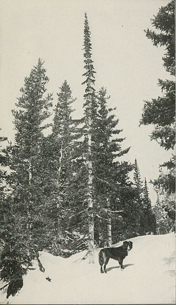 I waited a reasonable time for Scotch to return, but he did not come back. Thinking he might have gone by without my seeing him, I walked some distance along the summit, first in one direction and then in the other, but, seeing neither him nor his tracks, I knew that he had not yet returned.[54] As it was late in the afternoon and growing colder, I decided to go slowly on toward my cabin. I started along a route I felt sure he would follow and I reasoned that he would overtake me. Darkness came on and still no Scotch, but I kept on going forward. For the remainder of the way I told myself that he might have got by me in the darkness.