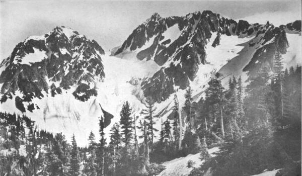 This same day I saw a number of goats abreast coming head foremost down a nearly vertical smooth wall; they had complete composure. They appeared to be putting on brakes with hoofs and dew claws. Loose stones which they occasionally started might have been serious or fatal for one in the lead had they been descending single file. As soon as they reached a ledge at the bottom they stopped to look round, and one of them stood up on hind toes to eat moss from an overhanging rock. Two near-by goats of another flock were limping badly. Possibly they had been struck by flying stones, or they may have been injured by a fall. These two accidents appear to be the[Pg 6] ones most likely to befall this or any other mountain climber.