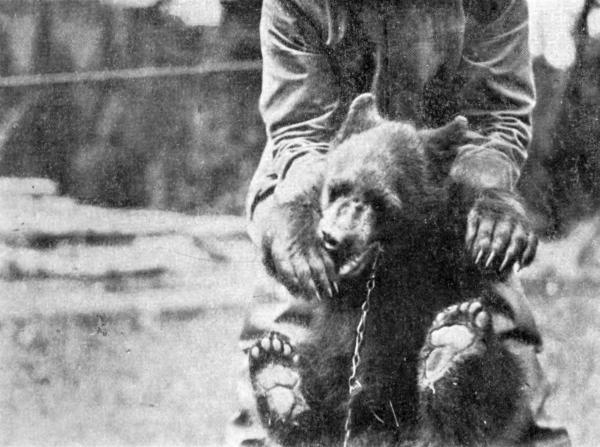One of this grizzly’s three cubs was caught. She and the two other cubs were waiting with the trapped one when the trapper came on his rounds, but at his appearance they made off into the woods. The trapper set a large steel trap and left the trapped cub as a decoy.
