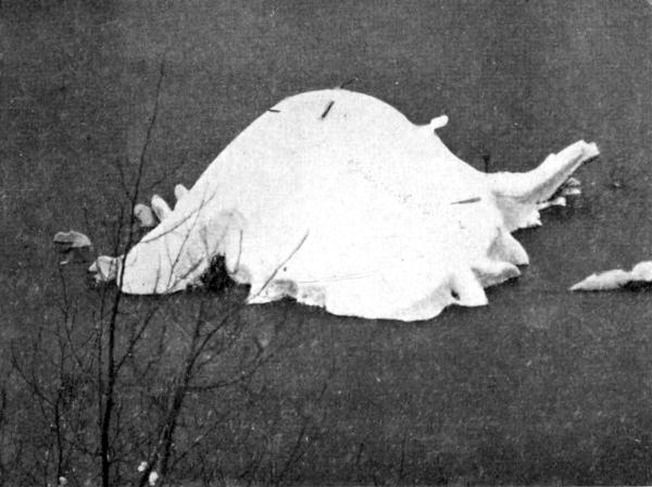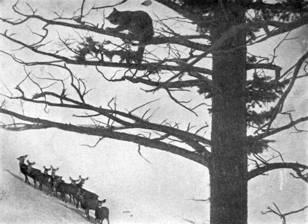 At timberline there were clusters of thickly[Pg 239] matted, low-growing trees with open spaces between. Closely pressed, the bears made a stand. Unfamiliar with timberline trees, two of the dogs in dodging the bears leaped into the matted growths. With feet half entangled they were caught by the bears before they could make the second quick move. The mother bear killed one dog with a single stroke of her forepaw and the cubs wrecked the other. The mother and cubs then charged so furiously that the remaining dogs retreated a short distance. Mother and cubs turned and again fled up the slope.