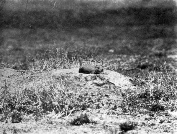 The prairie dog likes to keep close to his hole, or to the hole of a neighbour into which he can duck and escape the surprise raids of the coyote.