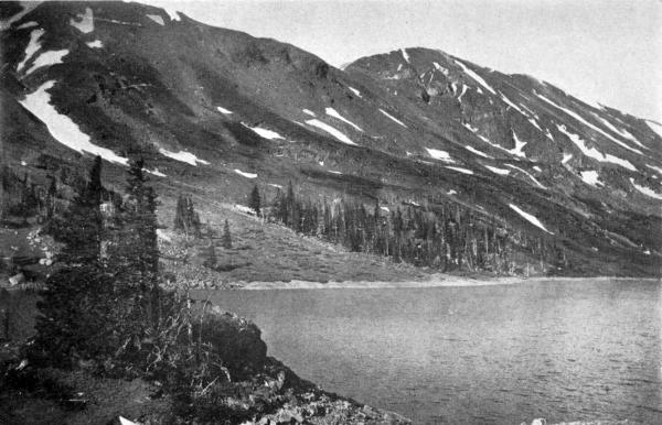 This rugged scenic mountain wilderness now is a part of the Rocky Mountain National Park. It must have been a wonderland for the childlike cubs. In the lower part of this territory are a number of moraines, great hills, and ridges covered with grass and dotted with pines. There are many poetic beaver ponds. The middle slopes are black with a spruce forest and cut with a number of cañons in which clear streams roar. Up at eleven thousand feet the[Pg 236] forest frays out with dwarfed and storm-battered trees. Above this the summit of the Rockies spreads out under the very sky into a moorland—a grassy Arctic prairie. Here, in places, big snowdrifts lie throughout the summer. To these timberline drifts, when fringed with flowers, the mother and the cubs sometimes came. The stains of their tracks upon the snow showed that the cubs sometimes rolled and scampered over the wasting drifts. They often waded in beaver ponds, swam in the clear lakes, played along the summit of ridges while the mother was making a living; and they often paused, too, listening to the sounds of the winds and waters in the cañons or looking down into the open meadows far below.