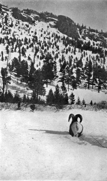 While crossing another ice slope they were suddenly subjected to a severe bombardment. A number of large rock fragments crashed down the steep slope, bounding, hurtling, and ripping[Pg 2] the air with terrific speed. The goats were directly in the path of the flying stones, which for a number of seconds bounded over them and struck among them. A small stone struck an old billy on the shoulder and knocked him sliding for some distance. When he regained his feet his shoulder appeared to be broken. Though making every effort to control himself, he continued to slide and presently tumbled into a crevasse. He caught with his good fore foot on the ice and clung for a second, made one desperate attempt to push himself back and almost succeeded, and then fell into the crevasse and disappeared.
