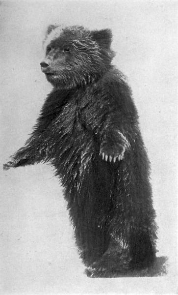 The mother bear promptly returned to rescue the trapped cub. In her excited efforts she plunged her right forefoot into the large trap. Many grizzlies appear to be right-handed, and her best hand was thus caught. An old grizzly is seldom trapped. But this bear, finding herself caught, did the unusual. She gnawed at the imprisoned foot to get away, and finally, at the reappearance of the trapper, tore herself free, leaving a foot behind her in the trap. She fled on three feet, driving the two cubs before her.