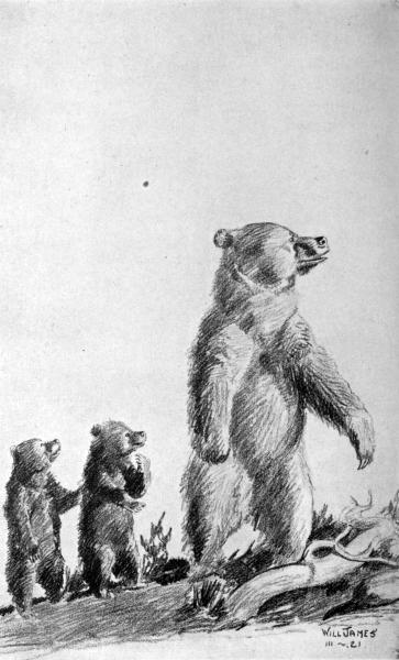 Just before he reached the desired point he looked across a ravine and down upon the summit of the parallel ridge. Sure enough, there were the bears! The cubs were leading, the mother bear limping along, acting as rear guard. Apparently she had injured her remaining forefoot. She climbed a small rock ledge to the summit, stood up on hind feet and looked long and carefully back down the ridge along which they had just travelled. While she was doing this the cubs were playing among the scattered trees. The mother grizzly rejoined the cubs and urged them on before her along the ridge. At every opportune place she turned to look back.