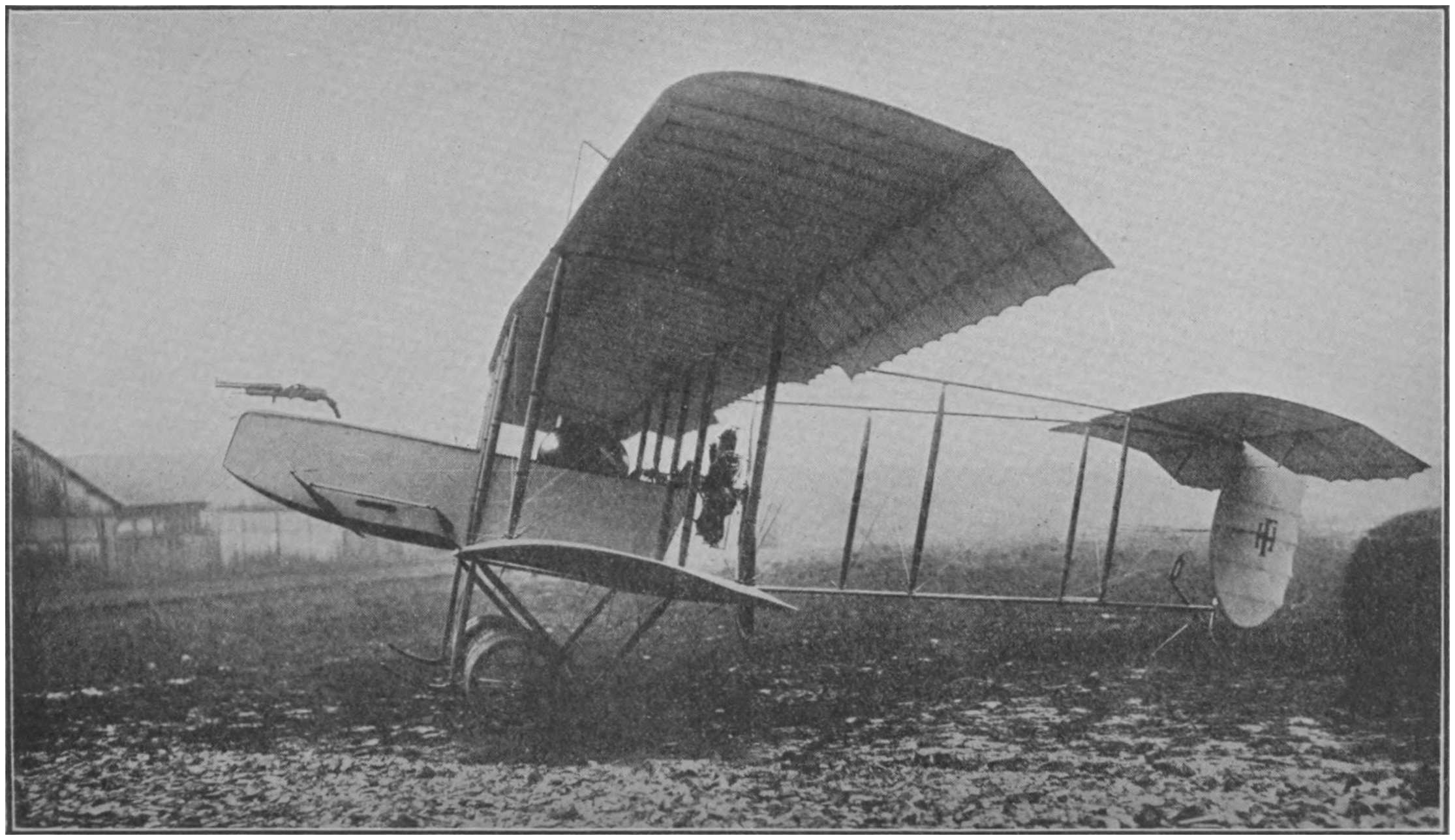 showing gun mounted in position, Gnome motor, ailerons on upper plane, rudders at rear (see Chapter VII.).