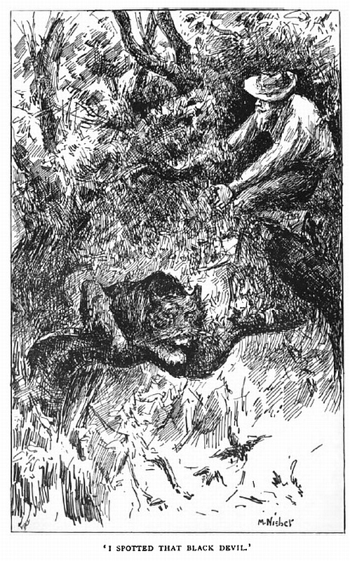 “’Twas not the lonesomeness so much as the emptiness that troubled me. Before the morning came, lighting up the valley, I was going down to the river on the last hunt. ’Twas do or die that trip—an’ it seemed to me I could see the gleam o’ my bones away down there through the mist that hung over the sick river. I made straight for the river, knowing there was a comfort an’ fellowship in the water which would draw game there, an’ the big black ram, too, ’fore he marched off inter the thick o’ the kloof for his sleep. By-and-by, as I went down among the rocks an’ trees, I pitched head first—ker smash—in a sudden fit o’ dizziness, but the shock did me good. It rattled up my brain—an’ instead o’ jest plunging ahead I went slow—slow an’ soft as a cat on the trail—pushing aside a branch here, shoving away a dry twig there, an’ glaring around with hungry eyes. I spotted him!”