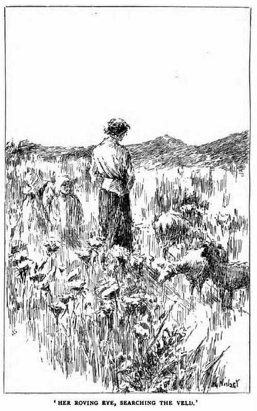 Young Piet looked after his father and feared, and urged his horse forward, and drew back as he saw dark figures crouching low along the hillside, and flitting swiftly from rock to rock. Up the hill his father went, menacing now one warrior, now another, with his rifle, getting at last above the cattle, then with a roar he turned and swept the herd before him down on to the rolling grass veld again.