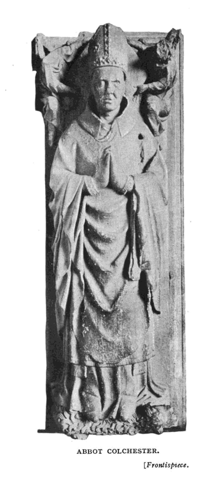 Our first trace of William Colchester's name on the books of the House is in connexion with his ordination as priest. I cannot tell what Bishop admitted him to the ministry, nor where it took place, but it can be ascertained that he said Mass for the first time during 1361-2 (the conventual year was reckoned for administrative purposes, as it is still, from Michaelmas to Michaelmas), and we are able to discover this, not because it was felt to be an event worth chronicling for its own sake, but because in that year three of the officers note that they severally expended 1s. 7½d. in bread and wine as "exennia"—i.e. a complimentary gift 9—made to him in [19] honour of the event. We may suppose that he was then twenty-three years of age; he may have entered the Convent in or about 1356; and we may take 1338 as the probable year of his birth. If, as we have assumed, he entered the Convent some years before his ordination, then he did so during the reign of Simon Langham, the most eminent of all our Abbots, but it is not possible to say whether he received priest's orders before or after the election of Nicholas Litlington to the Abbacy in April, 1362. The Monastery was still suffering in numbers from the ravages of the Great Pestilence in 1349, and consisted in 1356-7 of only thirty-five monks and two novices. Colchester was the last of five new members of whom we hear first in 1361-2.