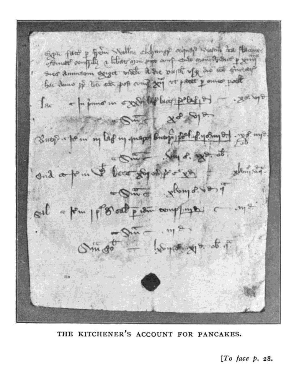 And now for some further light upon it. In 1389, [28] when Colchester had occupied the Abbot's chair for three years, the Kitchener was Brother William Clehungre or Clayhanger, who has left us his bill 16 for materials, and from this it will appear how the pancake-custom has developed in the interval. It sets forth his