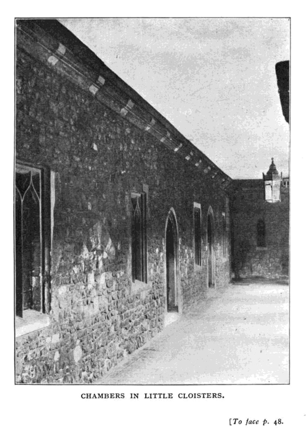 There is less doubt about the position of the chambers, which are often mentioned in connexion with the Infirmary, and which were probably attached to Little Cloisters, then recently rebuilt by Abbot Litlington. To this day the south side of Little Cloisters shows an alternation of old doors and old windows that suggests a row of almshouses. It thus becomes easy to realize that a separate residence, instead of the usual bed in the Great Dormitory, was a privilege highly prized and rarely conferred.