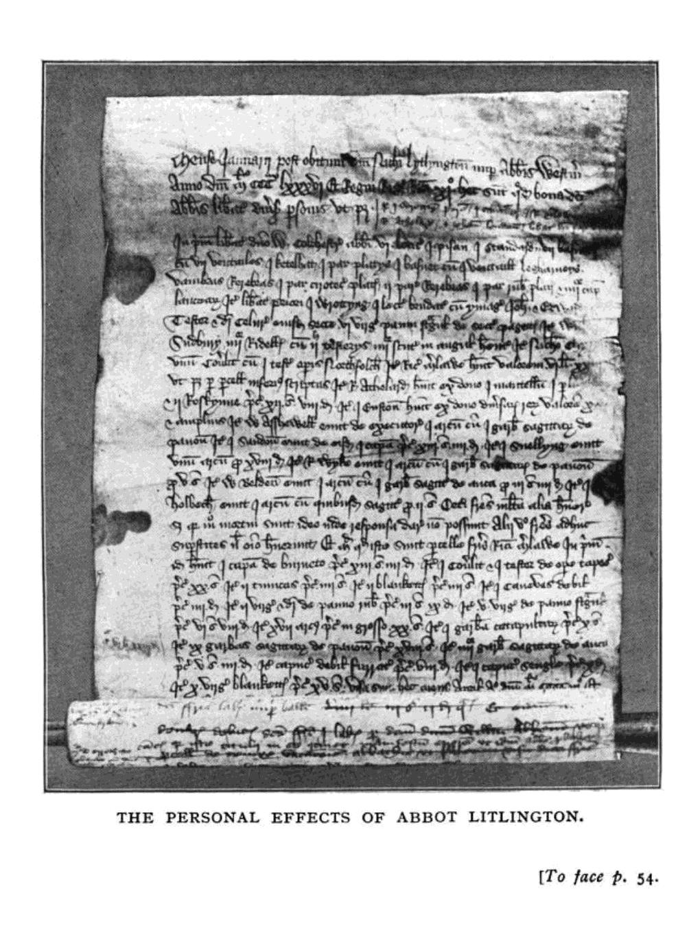 Such duties sensibly performed, William Colchester was not long in attaining to administrative office. To begin with, Abbot Litlington chose him as his Custos Hospicii; i.e. Seneschal or steward of his household. We have the roll on which the young monk gave an account of his stewardship for the year Michaelmas to Michaelmas, 1373-4, and as the doings it records represent his early experience of that conventual business in which he was to be immersed for nearly half a century, we may stay by it for a short space in order to get our impressions.
