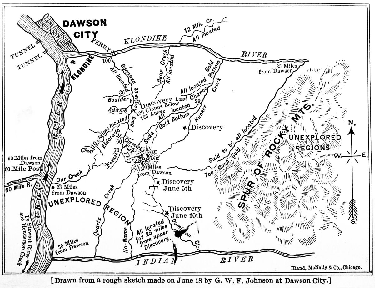 To make "a book about the Klondike" so shortly after that word first burst upon the ears of a surprised world, would be the height of literary impudence, considering how remote and incommunicado that region is, were it not the public is intensely curious to know whatever can be said authentically in regard to it. "The Klondike," it must be remembered, is, in reality, a very limited district—only one small river valley in a gold-bearing territory twice as large as New England; and it came into prominence so recently that there is really little to tell in respect to it because nothing has had time to happen and be communicated to the outside world. But in its neighborhood, and far north and south of it, are other auriferous rivers, creeks and bars, and mountains filled with untried quartz-ledges, in respect to which information has been accumulating for some years, and where at any moment "strikes" may be made that shall equal or eclipse the wealth of the Klondike placers. It is possible, then, to give here much valuable information in[v] regard to the Yukon District generally, and this the writer has attempted to do. The best authority for early exploration and geography is the monumental work of Capt. W. H. Dall, "Alaska and its Resources," whose companion, Frederick Whymper, also wrote a narrative of their adventures. The reports of the United States Coast Survey in that region, of the exploration of the Upper Yukon by Schwatka and Hayes of the United States Geological Survey, of Nelson, Turner and others attached to the Weather Service, of the Governor of the Territory, of Raymond, Abercrombie, Allen and other army and naval officers who have explored the coast country and reported to various departments of the government, and of several individual explorers, especially the late E. J. Glave, also contain facts of importance for the present compilation. The most satisfactory sources of information as to the geography, routes of travel, geology and mineralogy and mining development, are contained in the investigations conducted some ten years ago by the Canadian Geological Survey, under the leadership of Dr. G. M. Dawson and of William Ogilvie. Of these I have made free use, and wish to make an equally free acknowledgement.